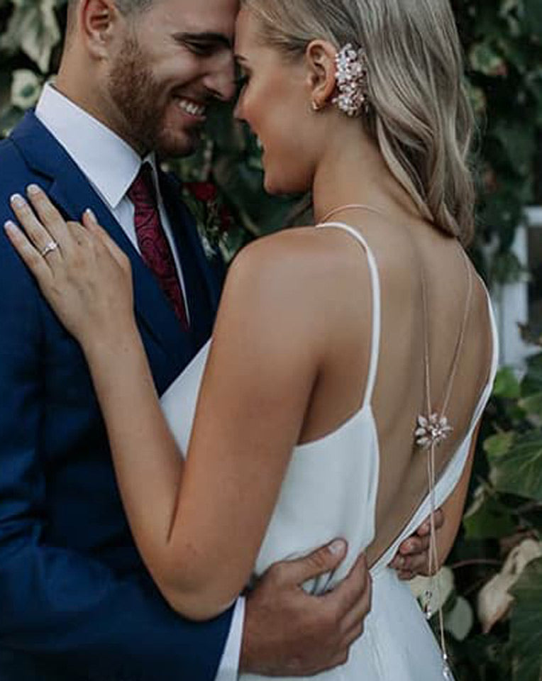 If you would like to wear a veil, ideally, a single long tier suits this look best. One sheek layer of tulle can add elegance and still showcase your back jewellery. Once the ceremony is over, take a few photos with and then remove to capture some amazing back shots to treasure forever.