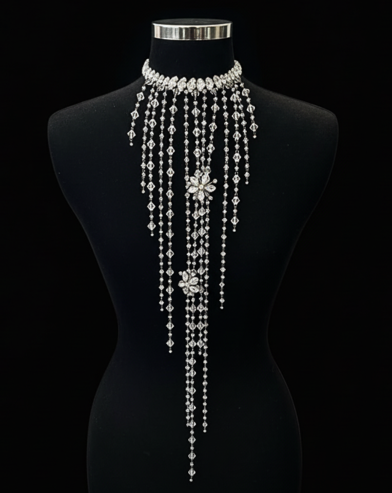 Two crystal star-flower brooches bring the cascading strands together, creating a celestial focal point that can be repositioned or removed to suit your gown and styling vision. Once the hero of our original Kezani campaign and brochure cover, Falling Stars is a true signature piece — dramatic, luminous, and unapologetically glamorous.