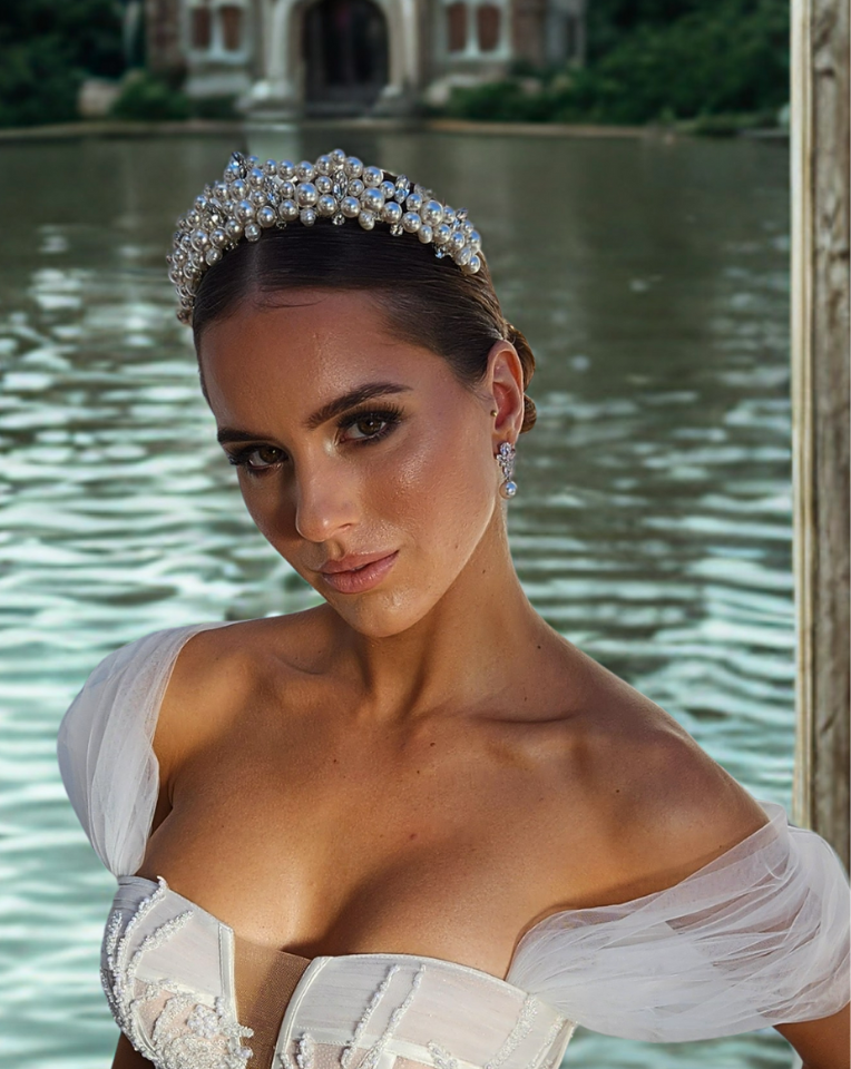 The Pearlin wedding crown is a statement pearl headpiece and goes with lace, satin, mikado and much more.