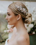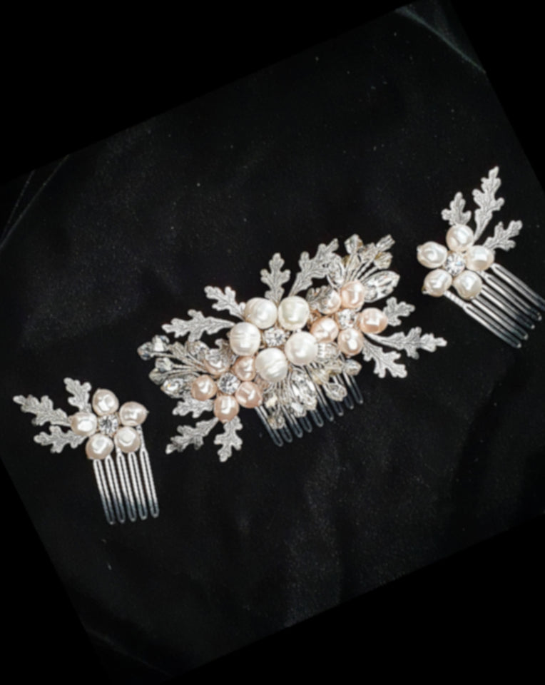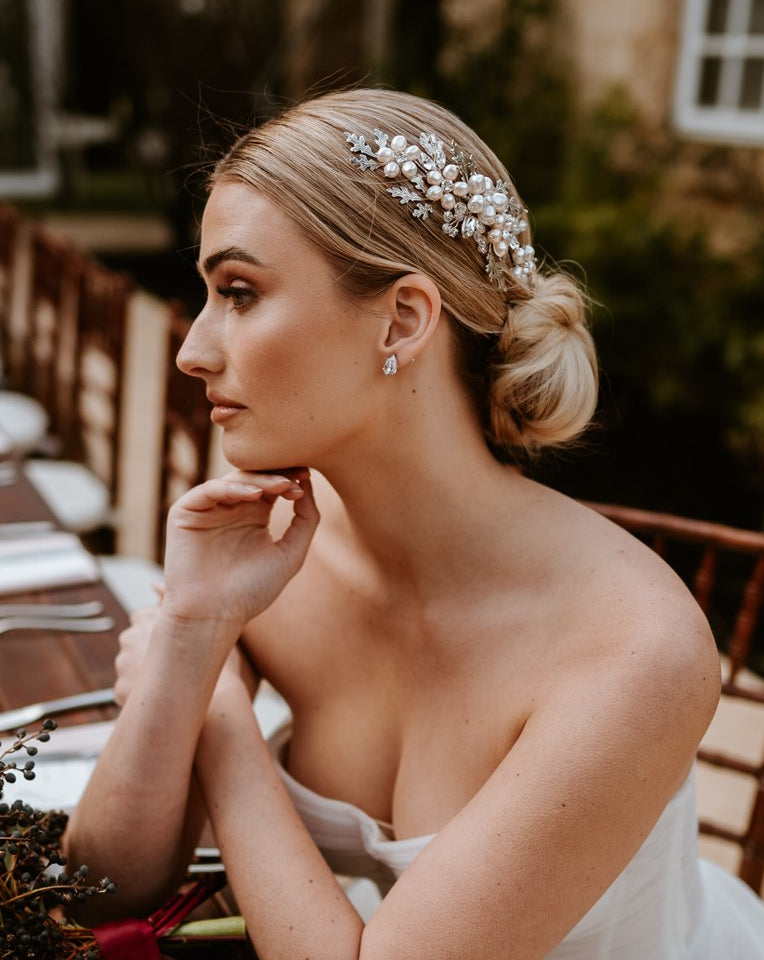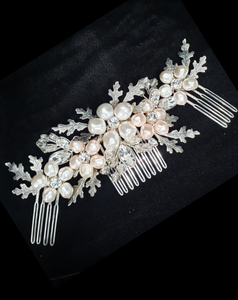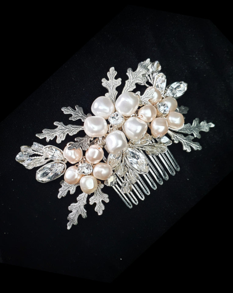 The Claudia is created with a freshwater pearl, handmade flower in the centre with vintage like leaves and crystal detailing on both sides with two crystal pearl flower combs to complement.