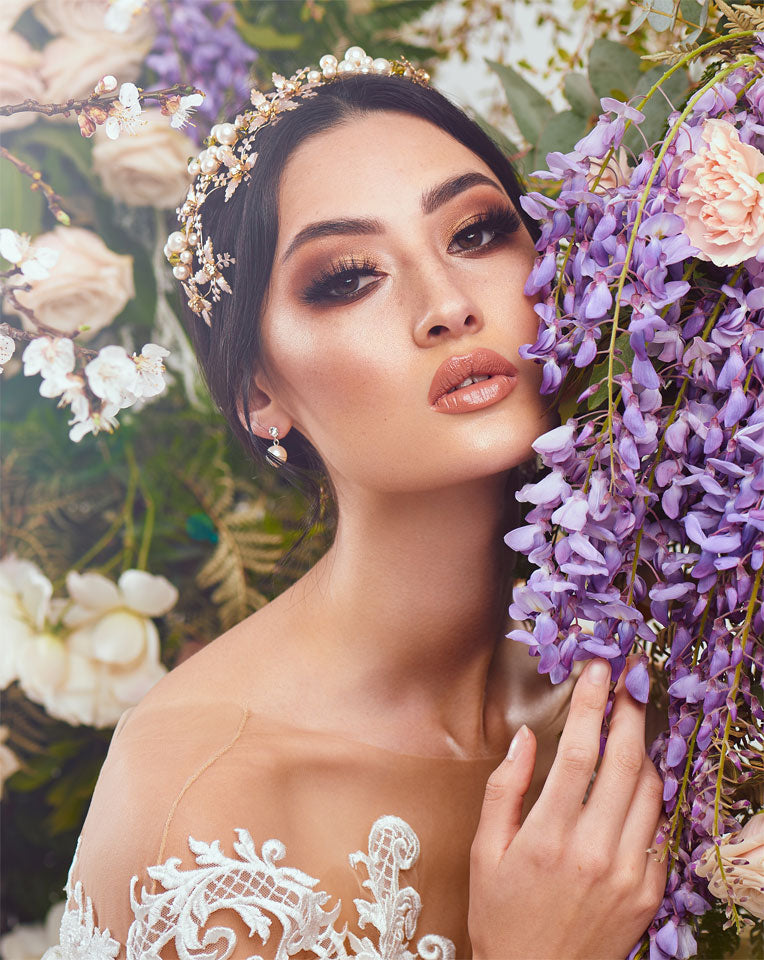 The 'Enchanted garden' band has a soft romantic feel with hair down and more of a sophisticated, classic bride feel with a sleek updo.
