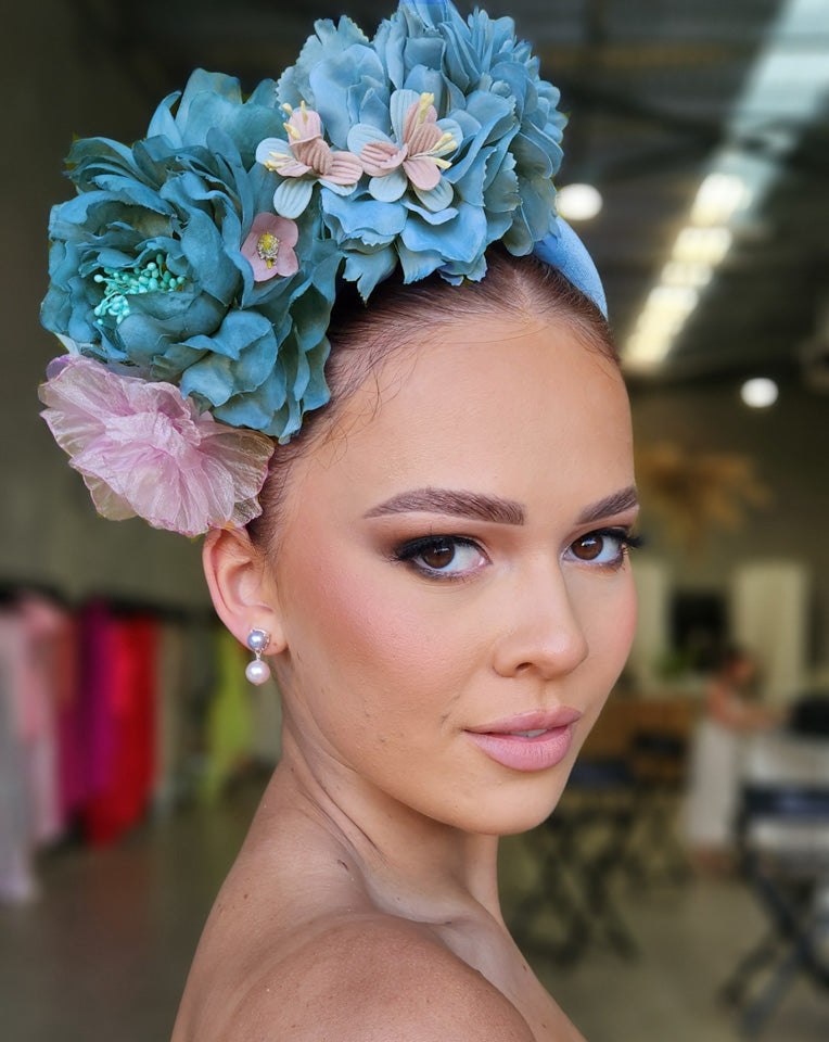 The Kitty floral race headwear is created with a combination of powder blue flowers, lilac organza flowers and more. A lovely floral garden and suitable for Melbourne Cup and race day events.