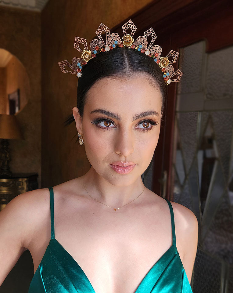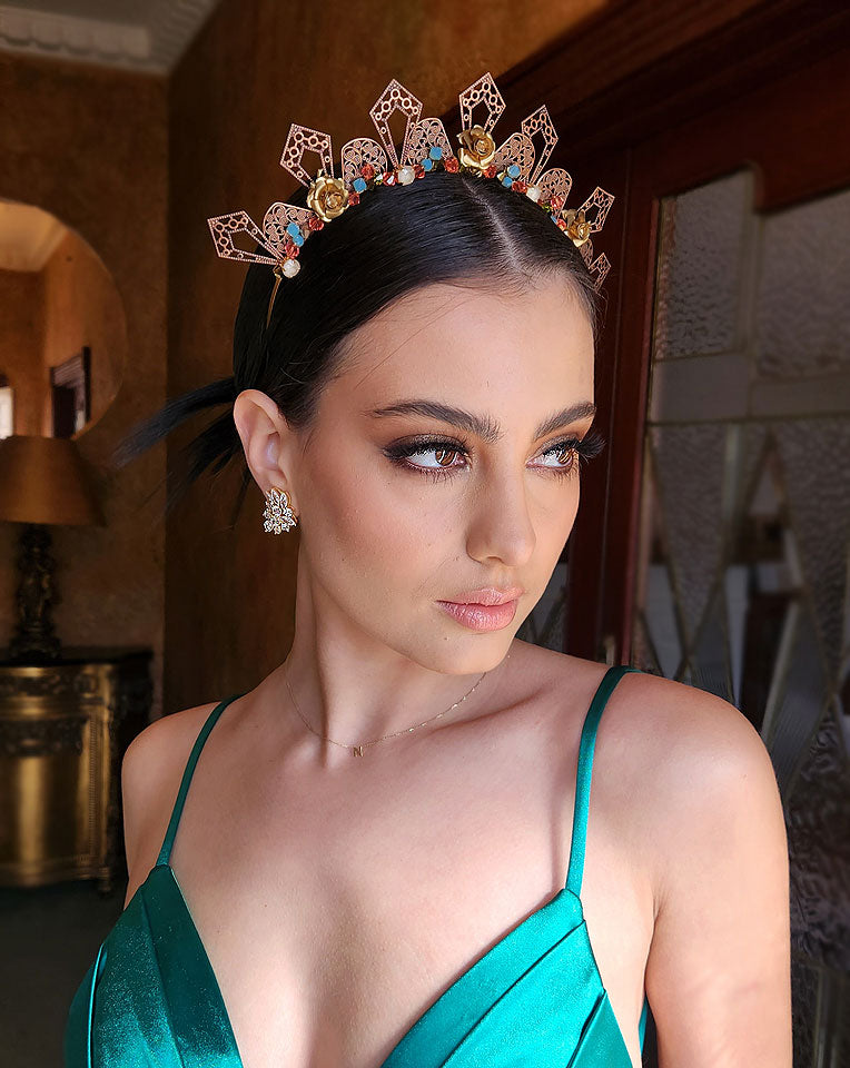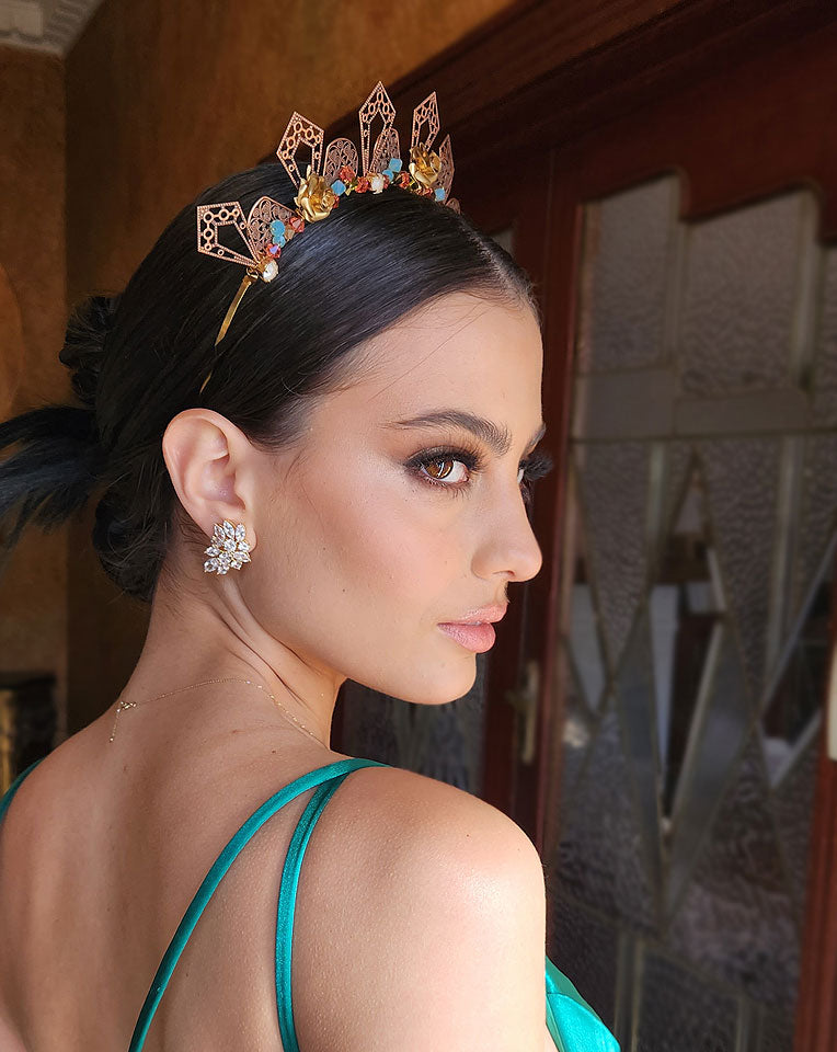 Race day fascinator - crown - headband - The Luna is a gorgeous rustic, rose gold bohemian mix crown. Small fan shape pieces forming a crown with three little gold rosettes and beading that will match many bohemian or floral style gowns with a crystal colour mix of watermelon, ivory, olive and pacific opal. As you can see with this emerald gown, it works with a contrast too!!!