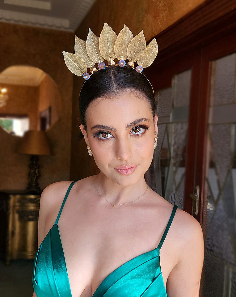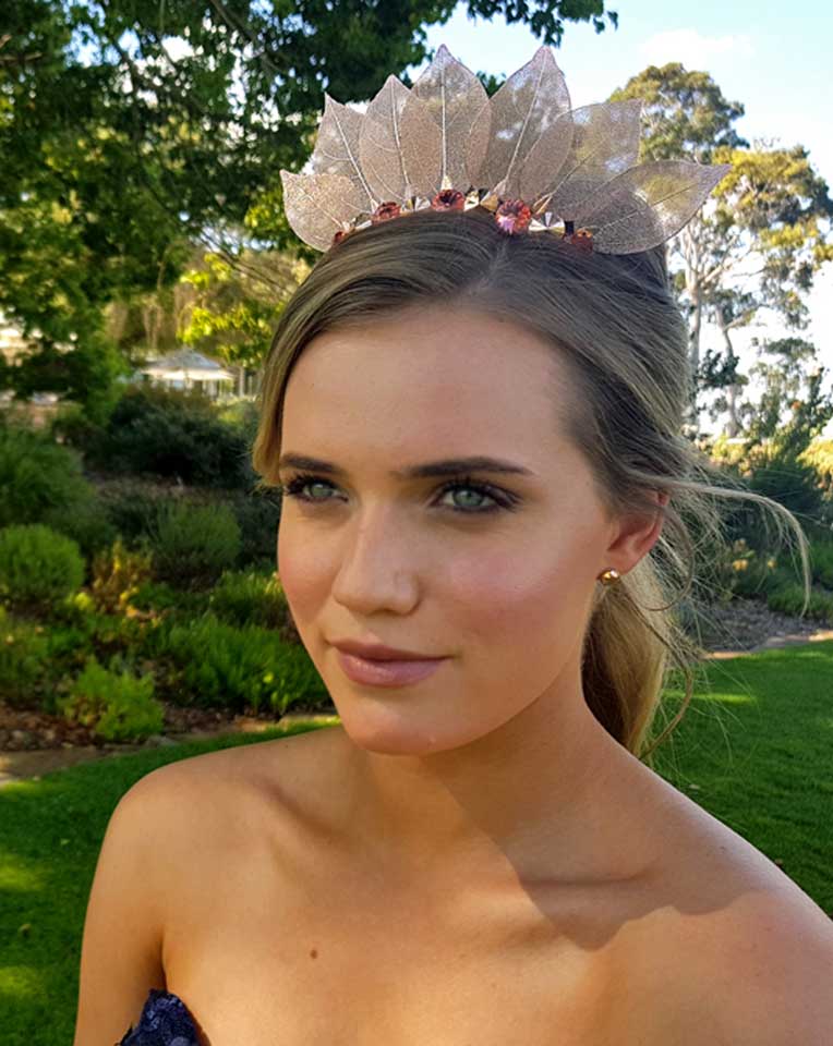 Race day fascinator - the Rio is a stunner gold leaf crown band. Large fine wired gold leaves with large rivoli crystals in spectacular colours to shine so pretty in the day or night.