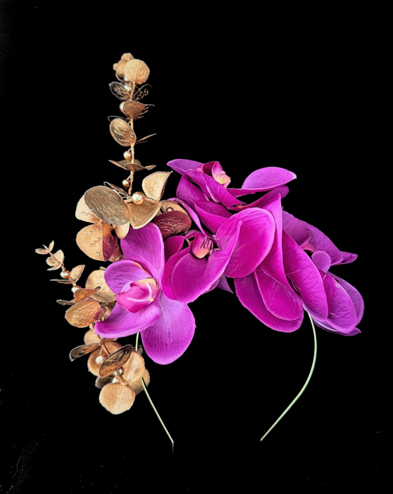 Race day fascinator - Fuschia pink orchid headband with gold scroll leaf stems with gold pearl detail. The Leilani is a floral showpiece that will brighten your day for sure!!!