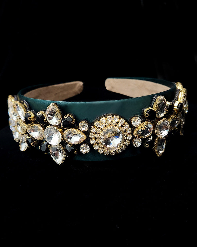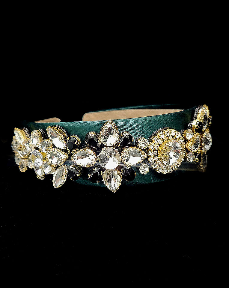 Race day fascinators and fashion jewelled headbands - The Yasmine jewelled band in Petrol green colour. This is a gorgeous beaded satin headband. Jewels are in gold plate casings with clear and jet black stones. Lined in soft suede like fabric.