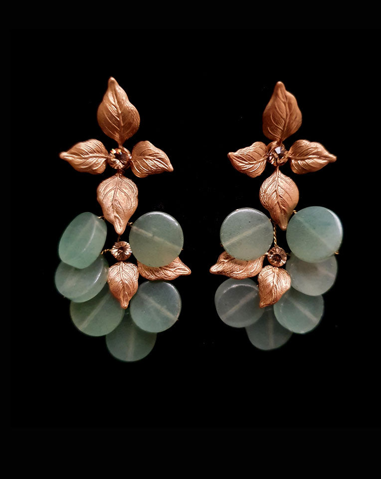 Bridal and Fashion earrings - a stunner 24k gold plate leaf stud with coin droplets of Adventurine, creating a piece of art for your ears.