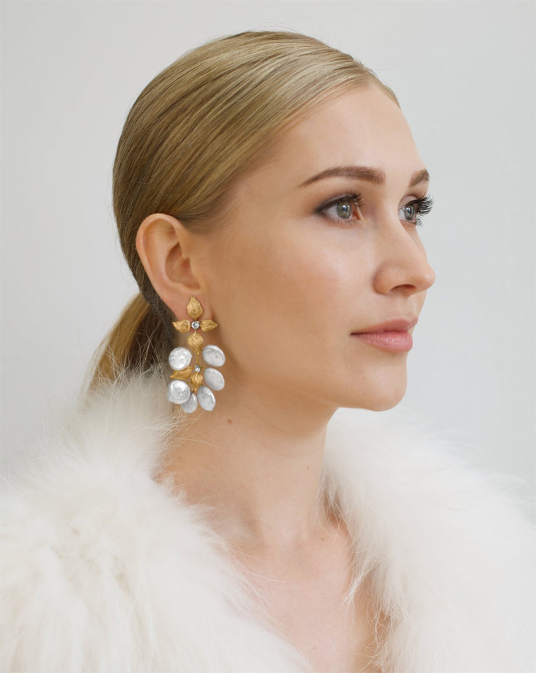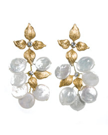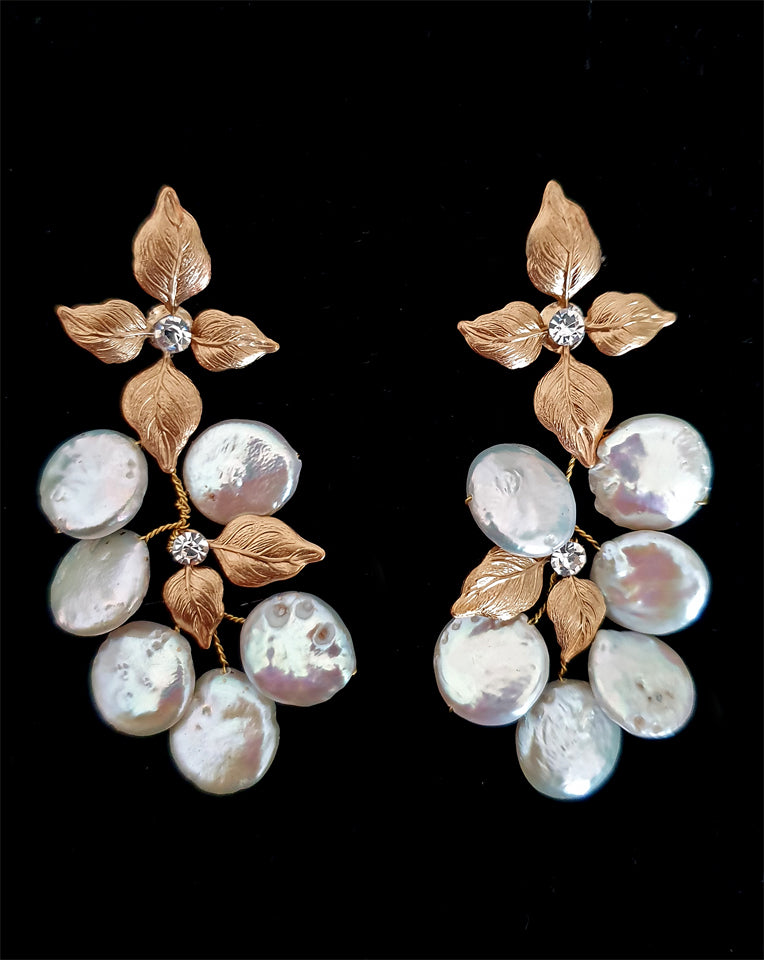 Bridal and Fashion earrings - a stunner 24k gold plate leaf stud with coin droplets of freshwater pearl.