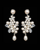 Bridal and Wedding earrings - pearl floral statement earrings, the Elizabeth by Kezani. These intricate pearl flowers have softly entwined with crystal and pearl creating a gorgeous feature earring finished with crystal and pearl drops.