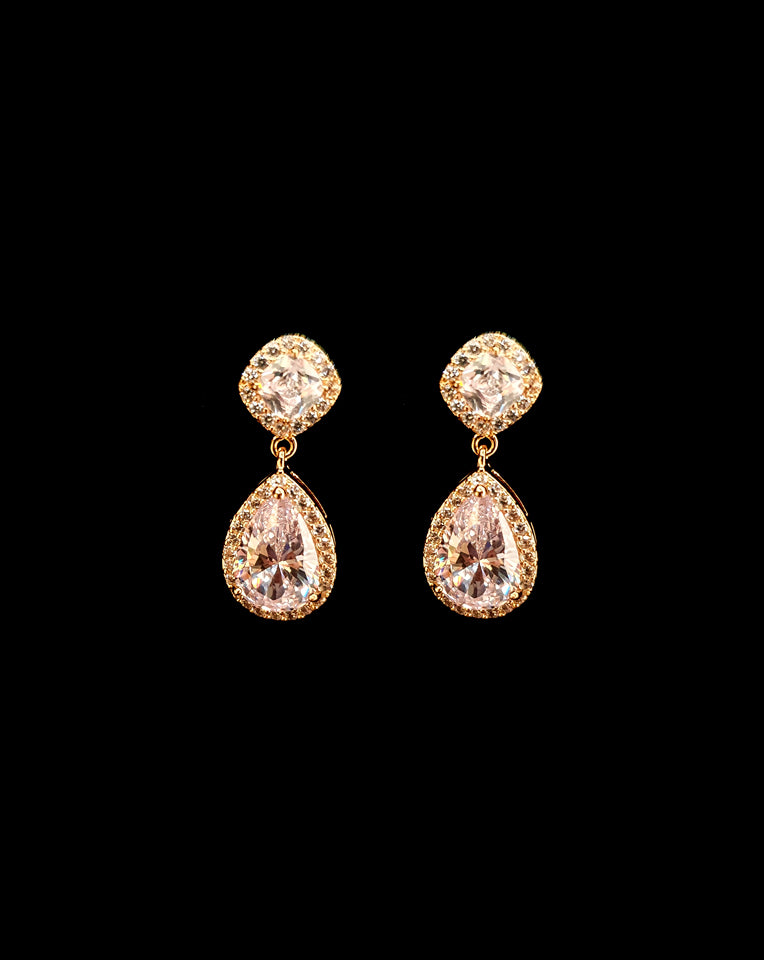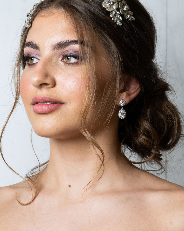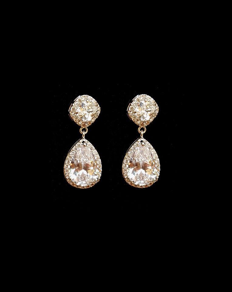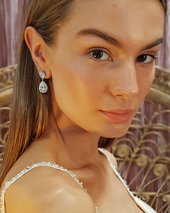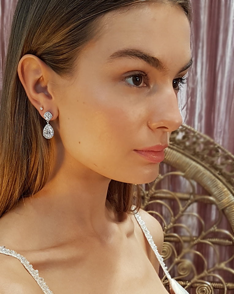 Bridal and wedding earrings - a small pear drop with halo surrounds and small square feature stud. This is a feminine, pear drop, simple and classic.