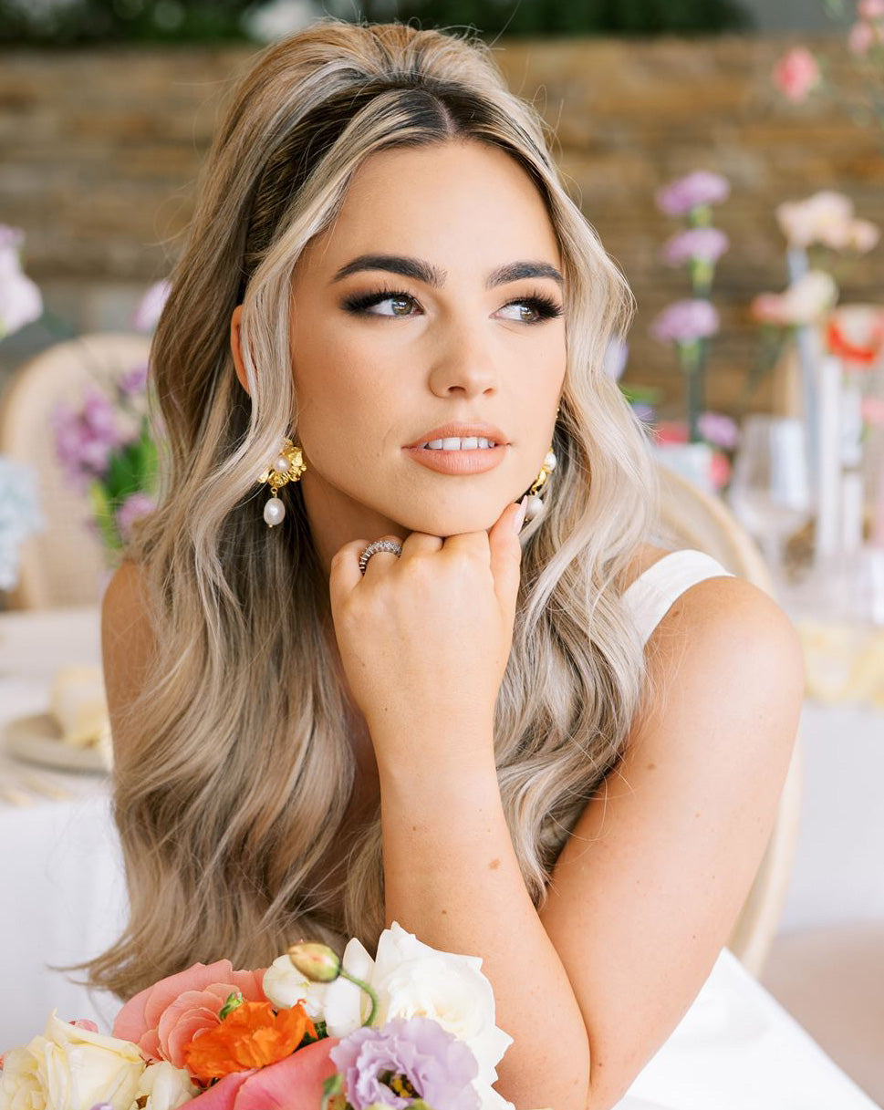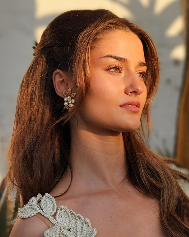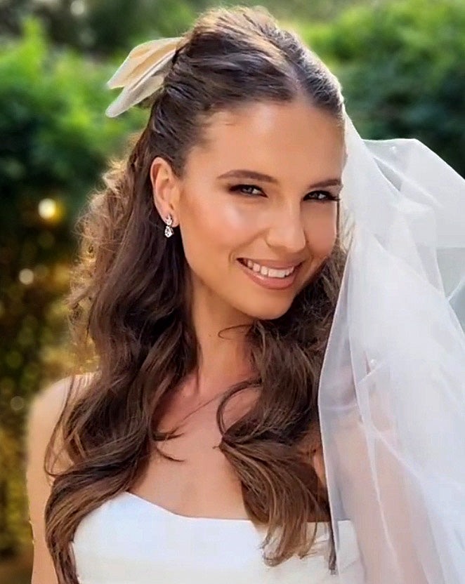 • Hair Down - Both delicate pieces and larger statement earrings work beautifully; drops peek through elegantly while smaller styles add subtle sparkle