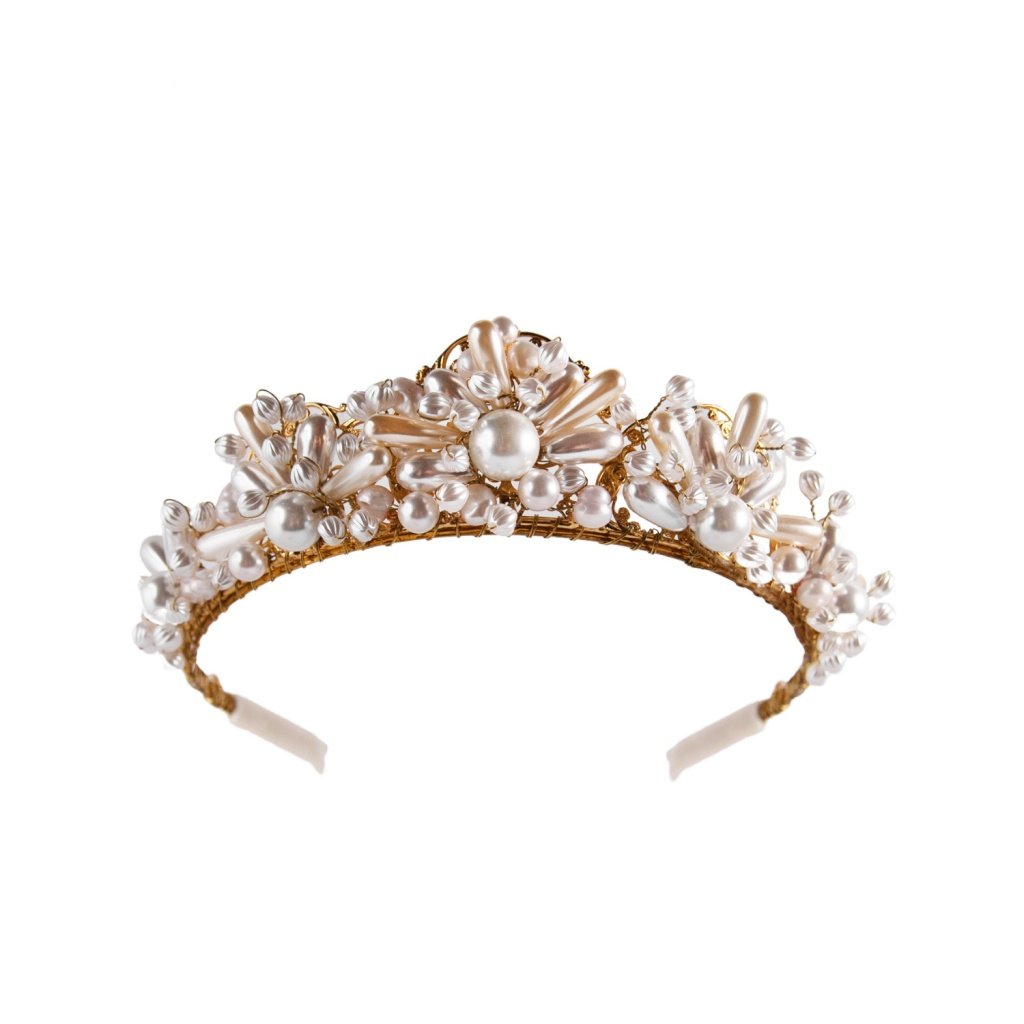 Bridal and wedding headpiece - luxury pearl princess crown for all those childhood dreams. The gorgeous Miss Ceylon Alice crown by Stephanie Browne is a true delight. A celebration of all things pearl, mixing Japanese and Australian freshwater with the best European crystal pearls and a scatter of vintage pearls. Embellished over the top of an antique gold filagree base.