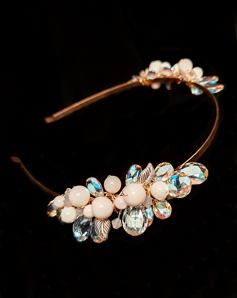 Bridal headband - this pearl cluster, crystal shimmer headband is stunning and cute all at the same time! The Kahlo has two gorgeous clusters entwined with ivory opaque pearls, crystal shimmer pear pendants and tiny vintage leaves, set on a headband in a unique form.