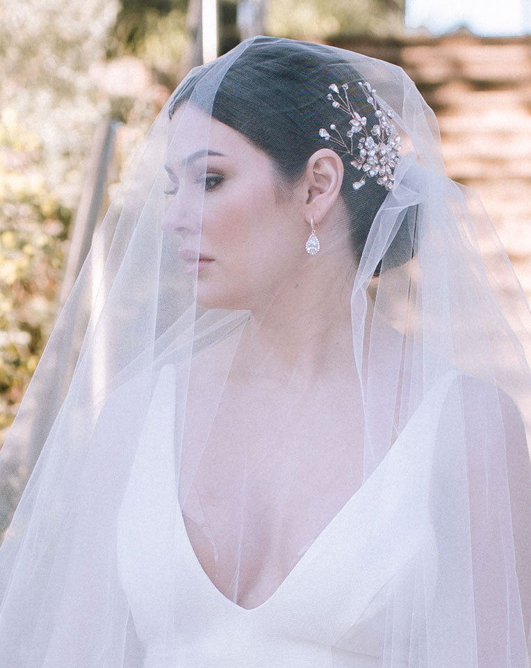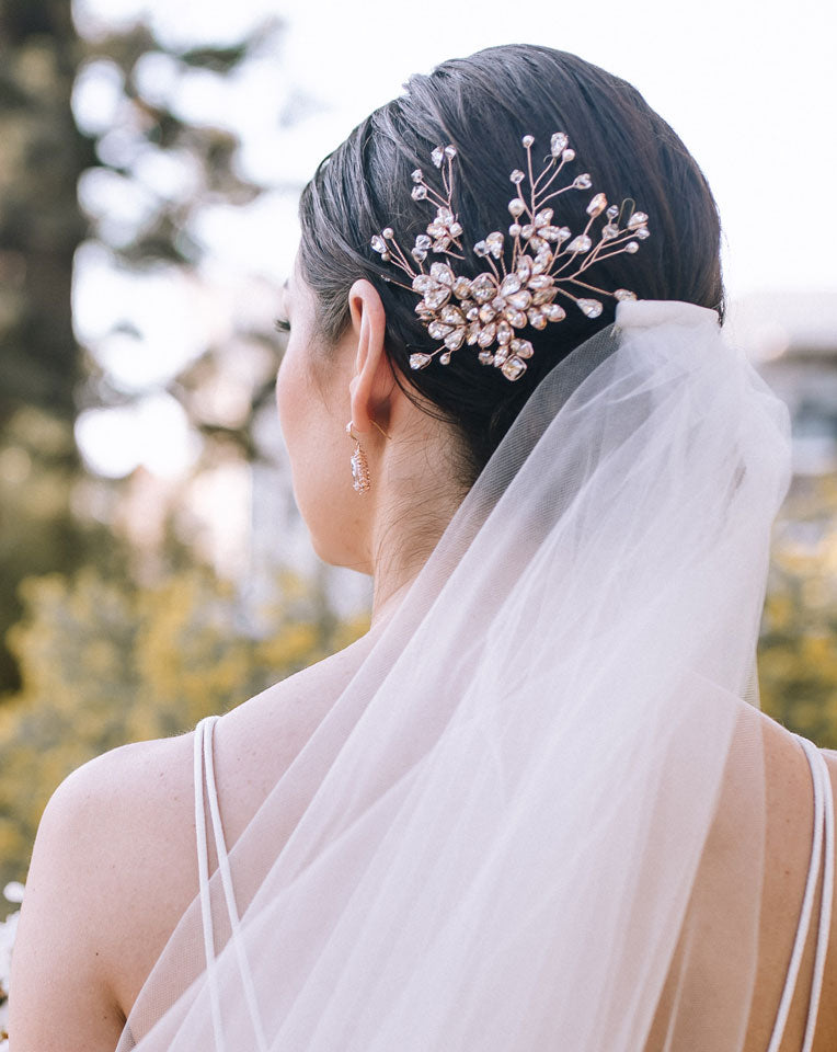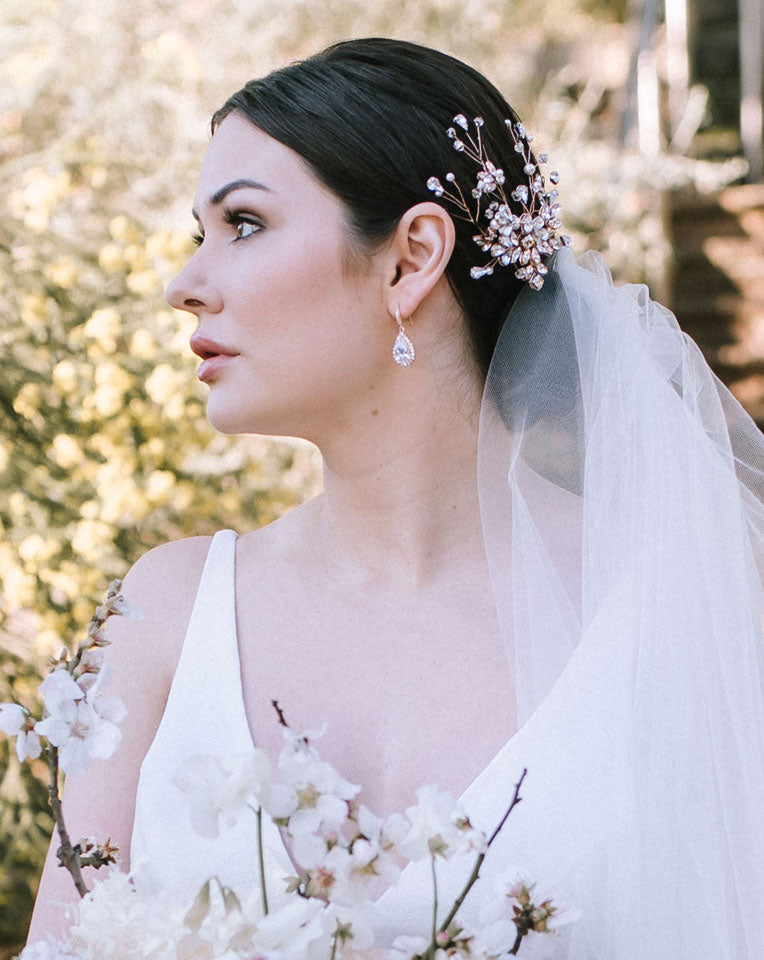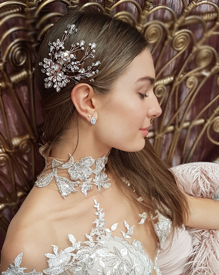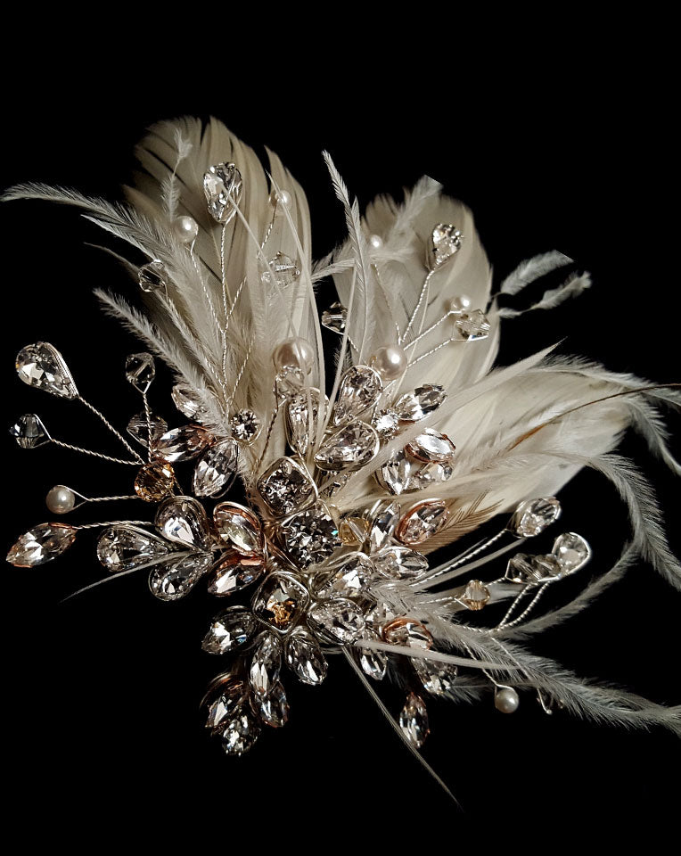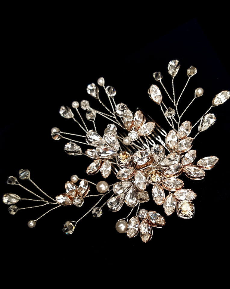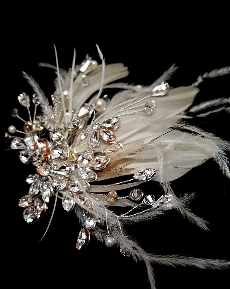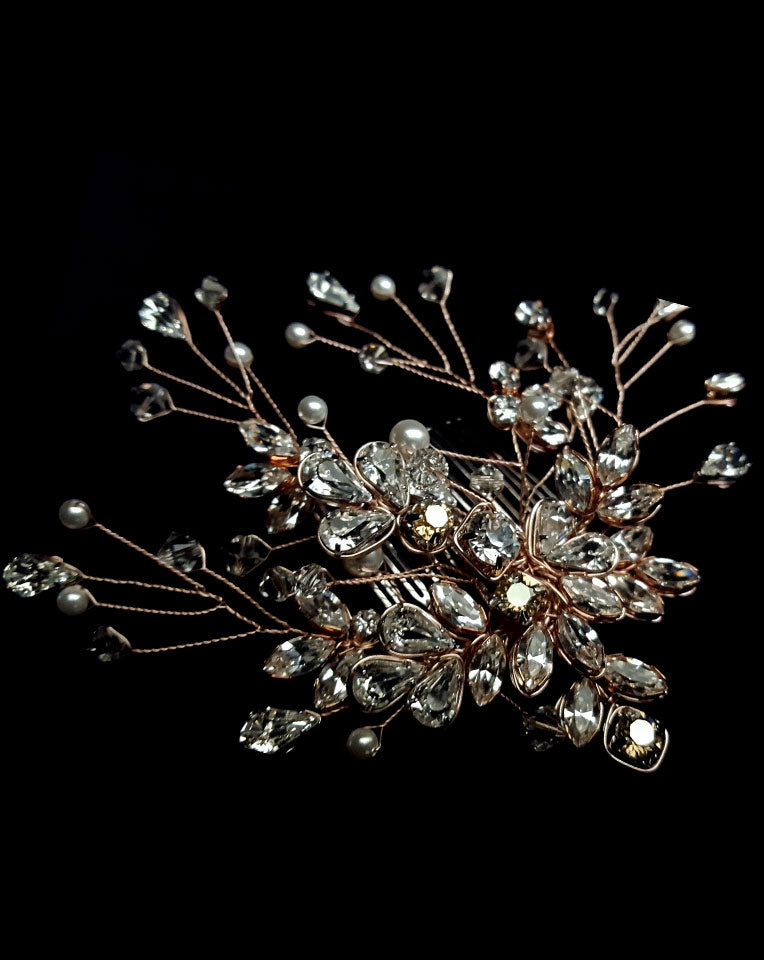 This comb is a variation of our original Claire headpiece which features this stunning side feature attached to a full hairvine making for a delightful and dramatic piece that can be worn like a headband or as a back and side style.