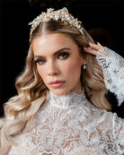 Bridal Headpiece - Grace Kelly lace headband with pearls and crystals, the Adonia is fit for a princess! A magnificent, lace crown enriched with crystal throughout with a scatter of pearls. This is a deluxe, statement piece still oozing with femininity. It's finer details on our original Adonia, sees a divine combination of champagne lace, clear crystals, encased in gold plate, and golden shadow bicones and white pearls. The main feature of the Adonia is it's handmade crystal pendant stems that are scattered throughout.