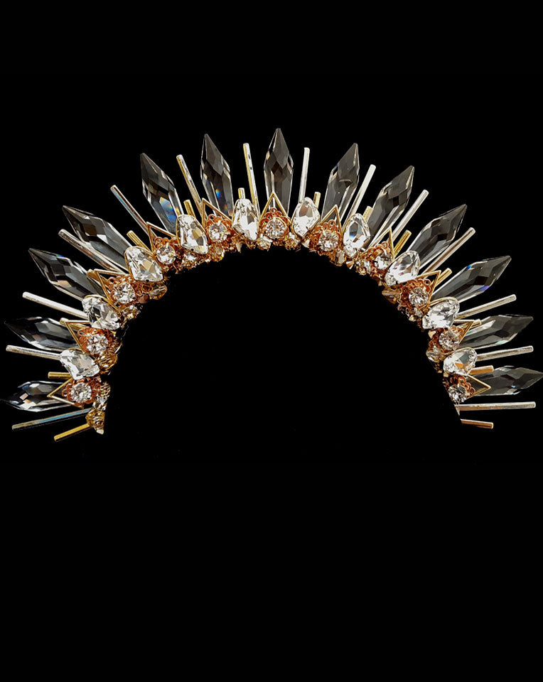 The Courtney crown has a fan of crystal spikes alternated with silver and gold spokes on a headband and then intricately detailed with big juicy pieces of crystal encased in silver and rose gold with baroque filagree and little gold plated triangles.