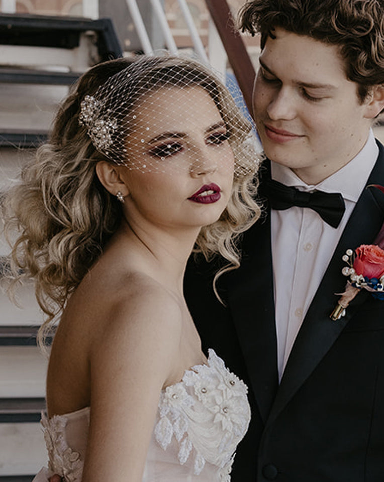 The Jocelyn set offers versatile elegance, perfect for wearing with or without a veil, and complements everything from grand ceremonies to intimate elopements. A truly timeless addition to your wedding ensemble.