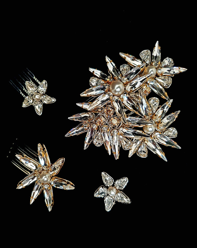 Created with shard-like crystals into a star flower shape with pearl centres, this collection of combs can be worn altogether or scattered through your hair in your own unique way.
