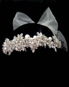 wedding and bridal headpiece - embellished crystal garland band with tulle bow. The Titania headpiece is as romantic as they come. This jewelled band is encrusted with crystal and star flowers and can be worn as a tradional headband or onto the forehead for stunning floral garland feel. The tulle bow is removable.