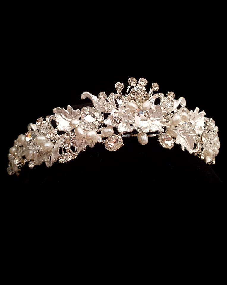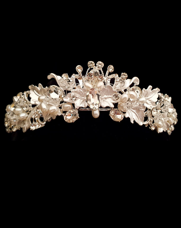Bridal and wedding headpiece - Our NEW ARRIVAL from the Johnny B Collection. The stunning Joie crown is created with matt silver leaves dramatic crystal and a gorgeous combination of oval crystals, white pearls and a scattering of smaller crystals.