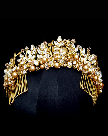 The Diva silver crown has a mix of white pearls and clear bicone crystals, marquee crystal leaves and silver antiqued branches. It is also available in gold with a touch of rose gold and other custom tones upon request. Sits very comfortable on the head and has a softness with the frame that allows you to mould to head easily.