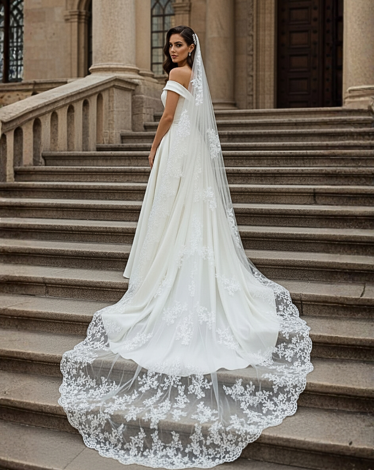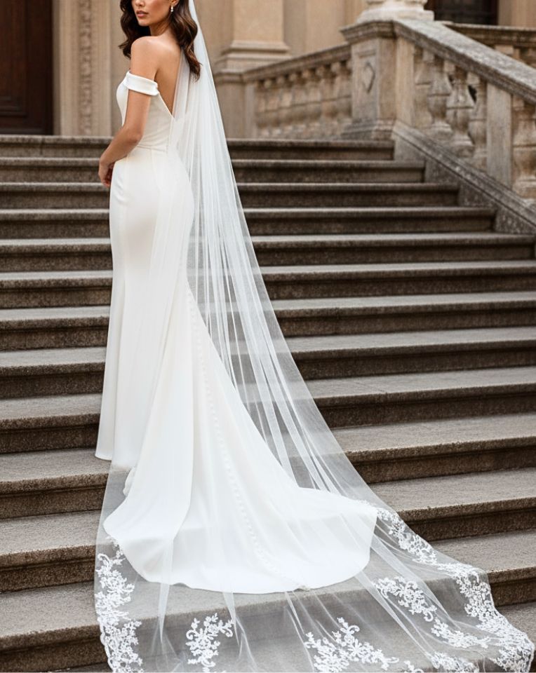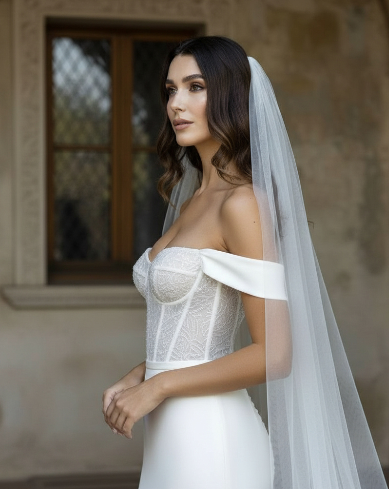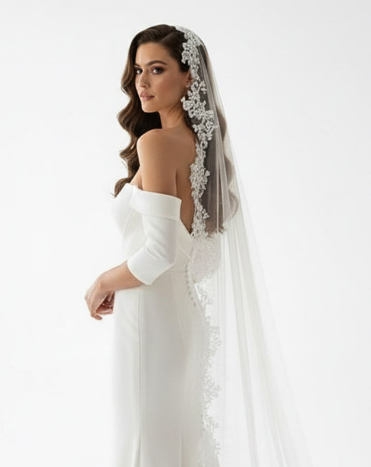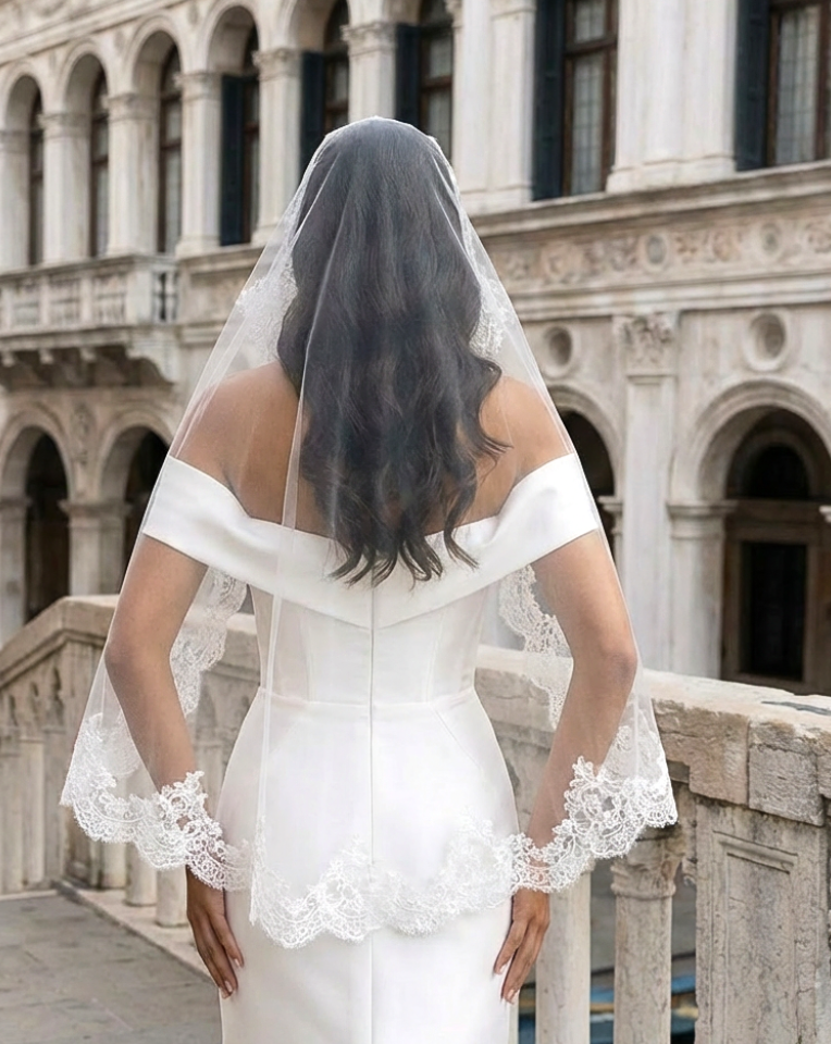 Gown Details: If your dress features stunning back details, intricate lace, or a dramatic low back, a single-tier veil will showcase these elements perfectly.