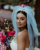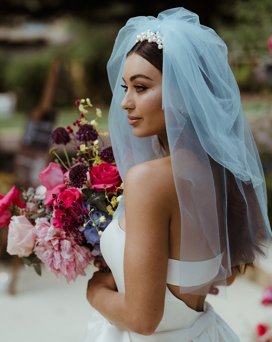 wedding veil - hens veil - short blue veil with pearl centre - Little Bow Blu at Kezani