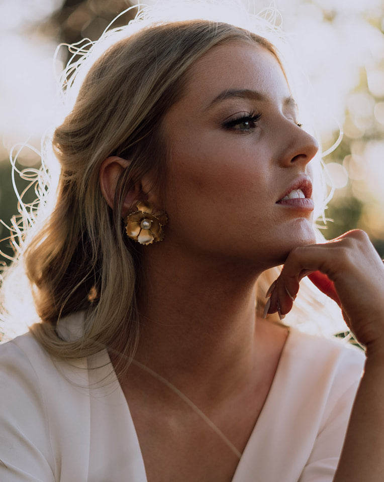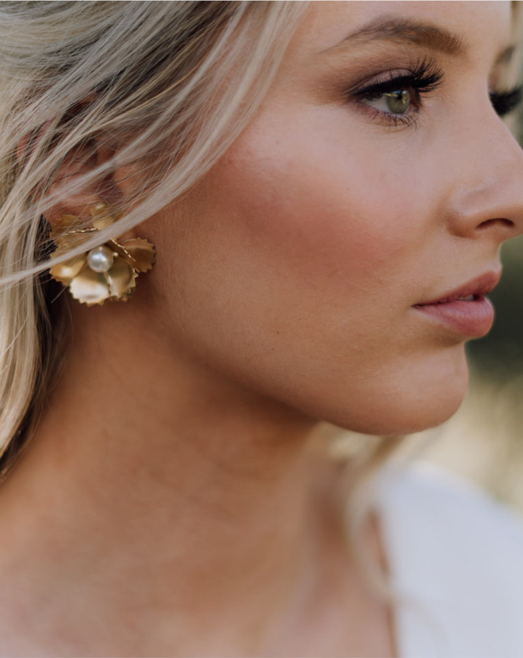Bridal earrings - divine 3D gold petal flower earrings. The Chloe earrings are a feature all on it's own. If you want to keep it simple, this is all you need, though very adaptable, to style you from boho luxe to classic bride vibes.