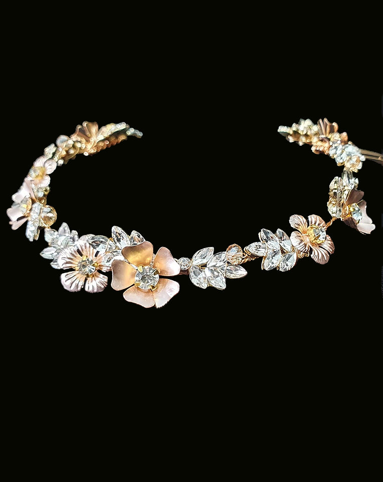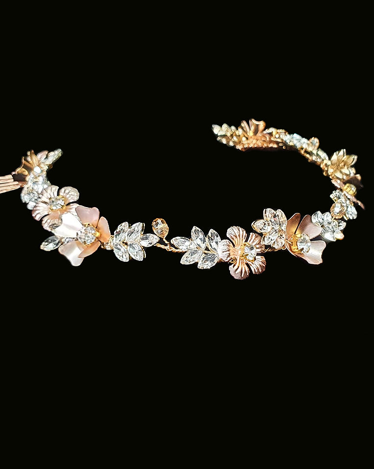 Bridal and wedding headpiece - this soft, rose gold, vine headpiece is truly gorgeous. A combination of pale rose gold metallic flowers with crystal centres and sparkly, crystal leaf features.
