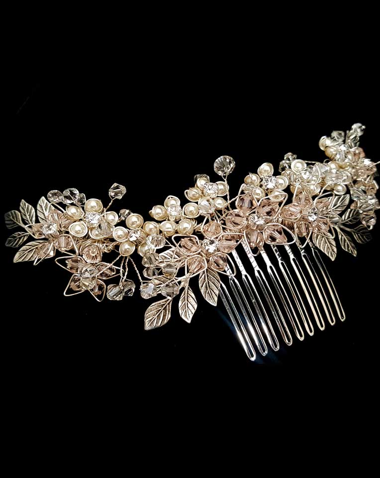 The Jessica is very detailed with delicate mix of crystal flowers and small pearl flowers, vintage metal leaves and crystal stamens.