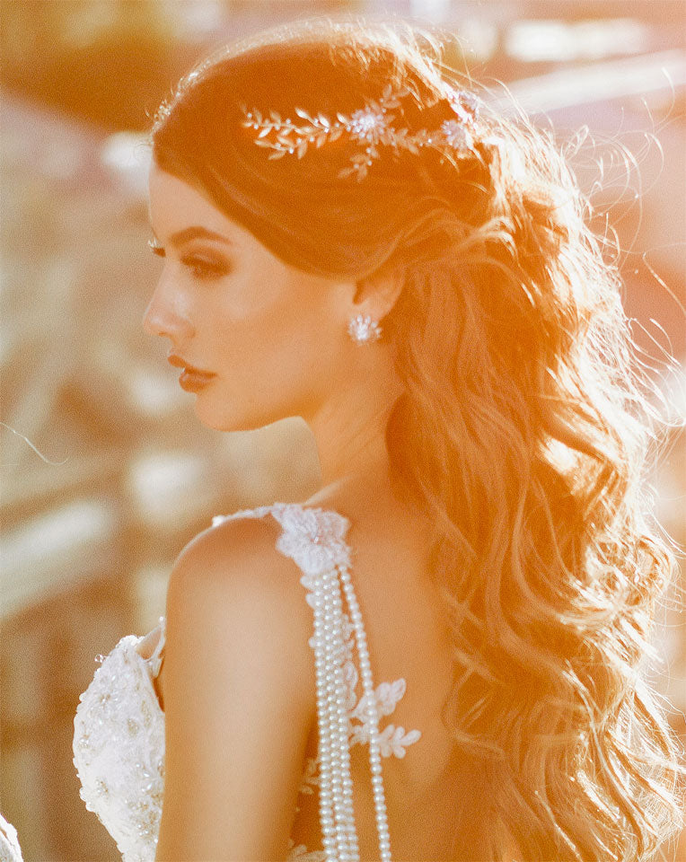 This headpiece looks best nestling into a soft and undone look upstyle or half-up style hairdo.
