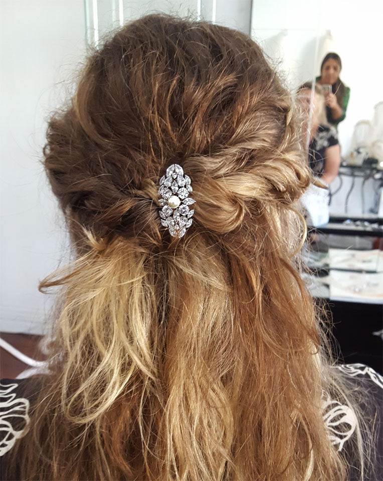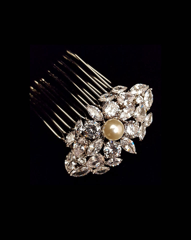 Created from a combination of navettes, pears and round crystals and finished with a pearl in the centre and a wire comb.