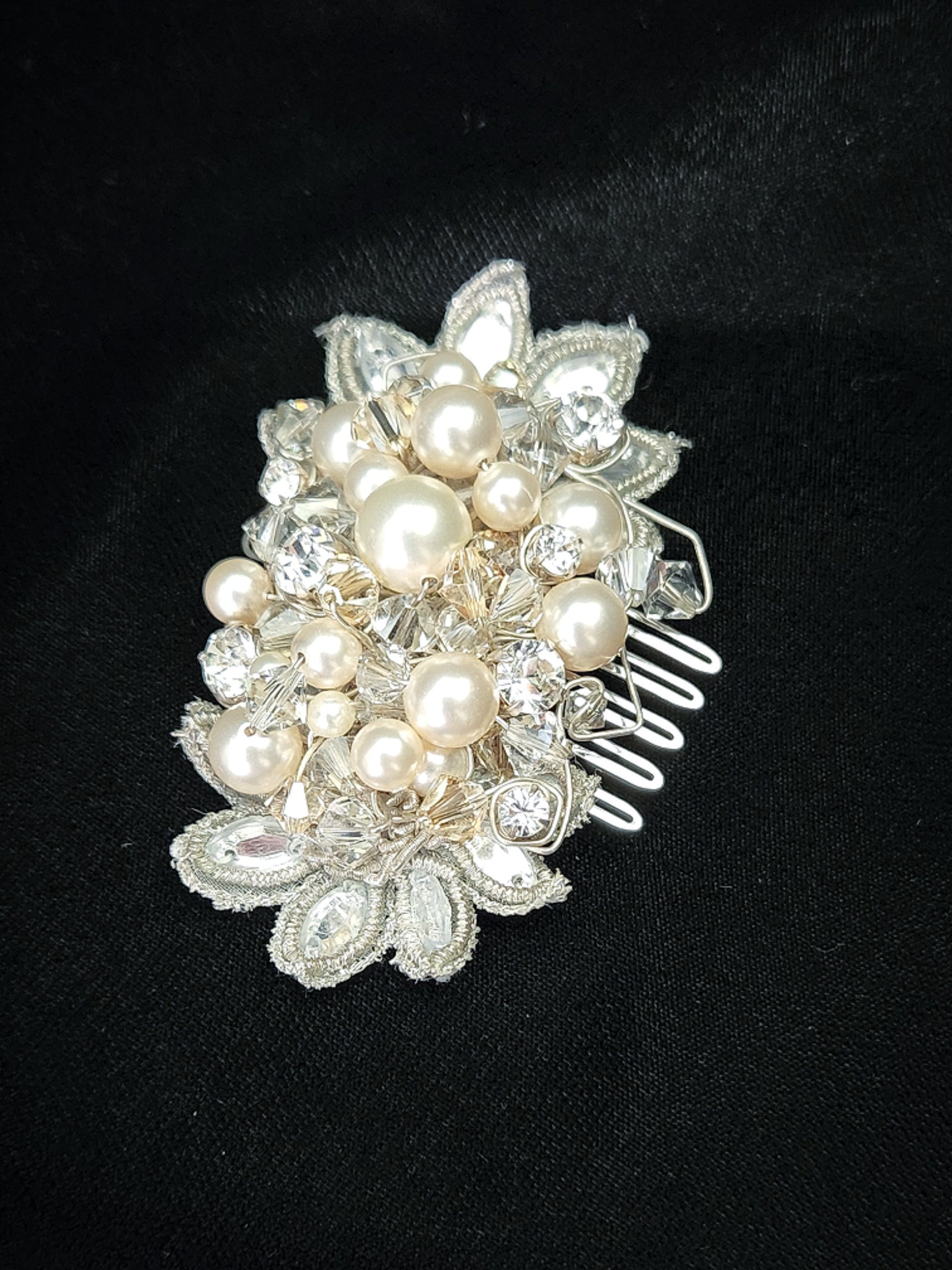 A stunning brooch like piece, clustered with an ivory pearl combination, vintage silver crystals and a touch a golden shadow shadow crystals. A touch of beaded pewter trim has been tucked into the sides allowing this pearly cluster of joy to be worn with many shades of ivory and champagne.