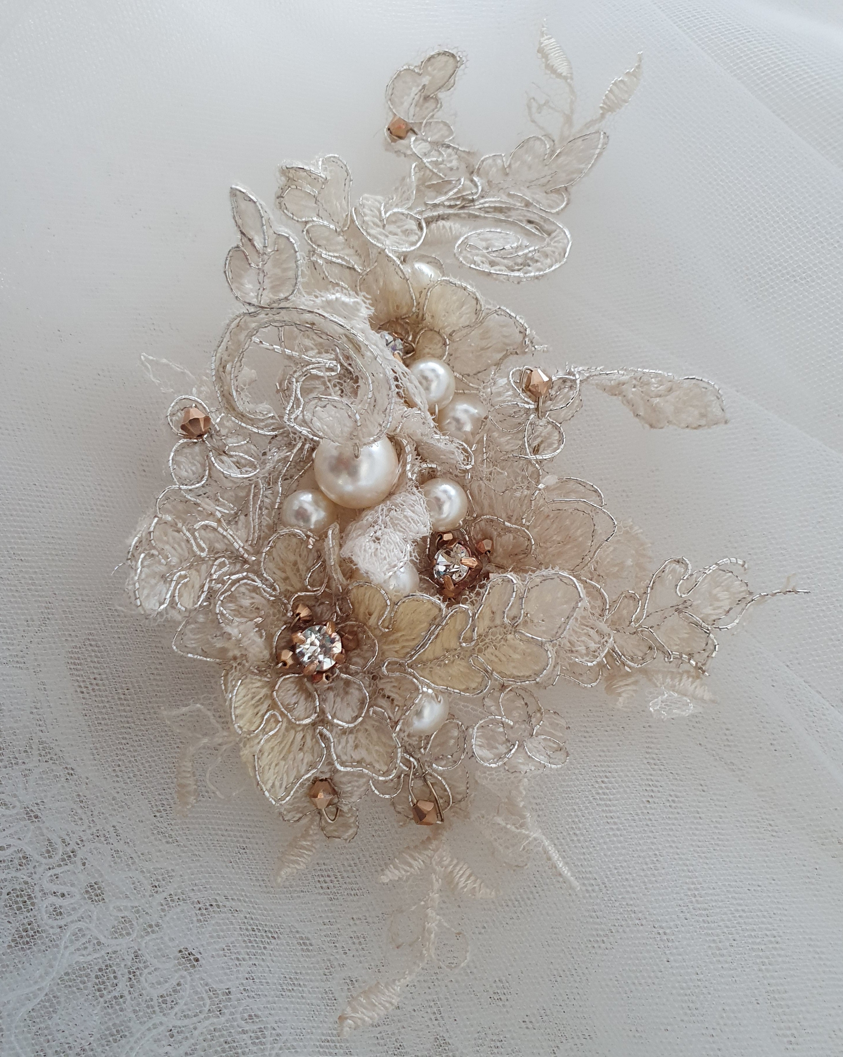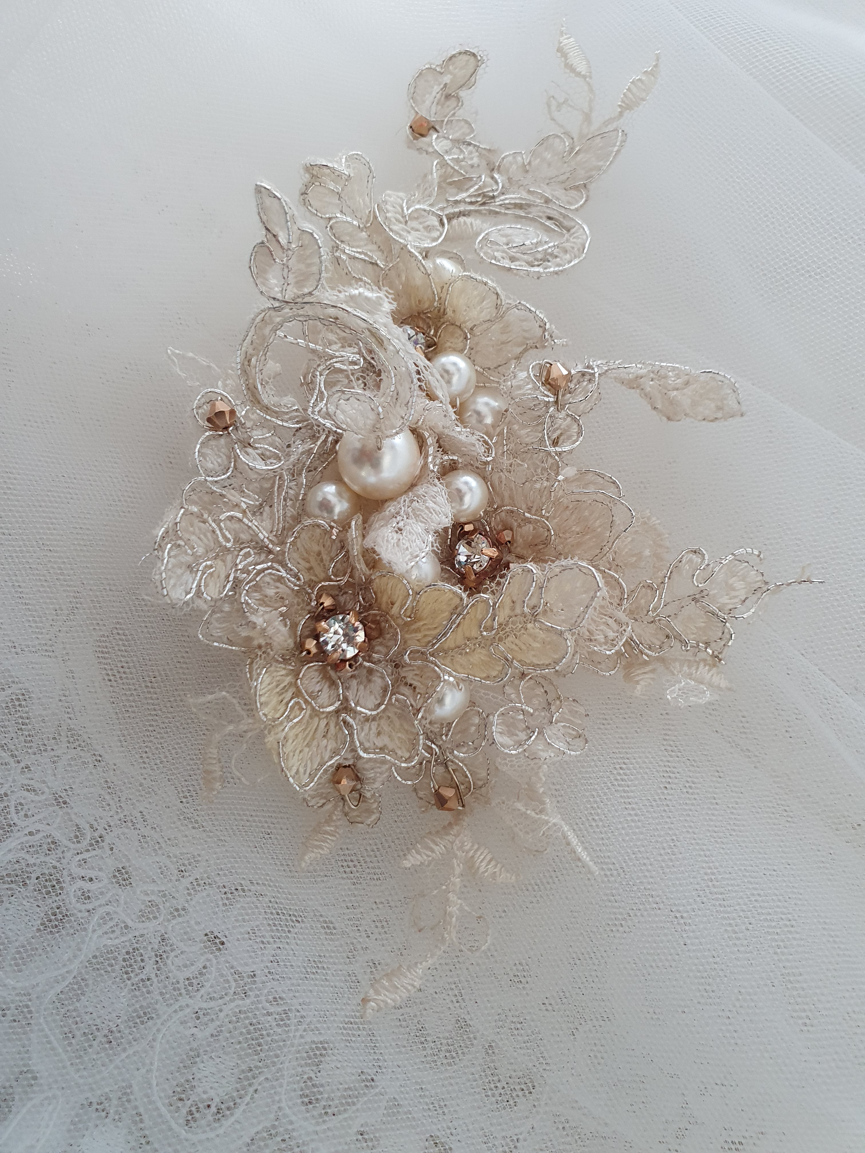The Briony is a 3d lace headpiece that can be worn on the side. Lace has been dyed to a champagne/rich ivory tone. The crystals are in a rose gold casing and we have added a few white pearls to this piece. The lace has a fine silver cord that outlines the flowers and leaves in this piece.