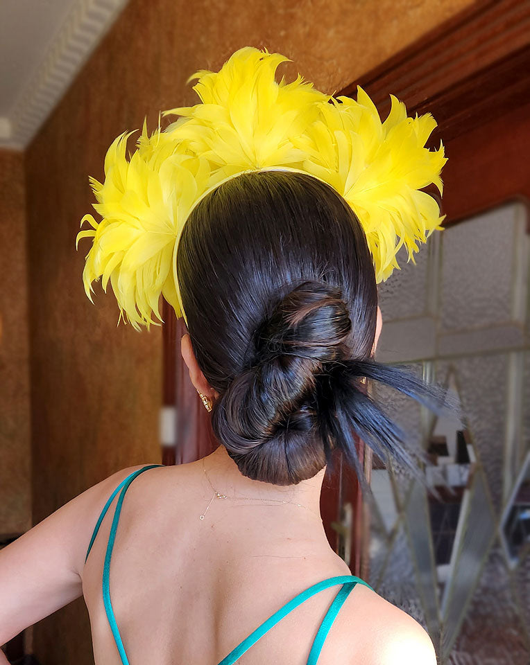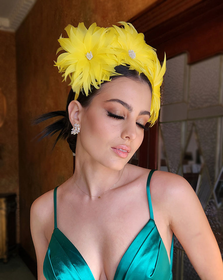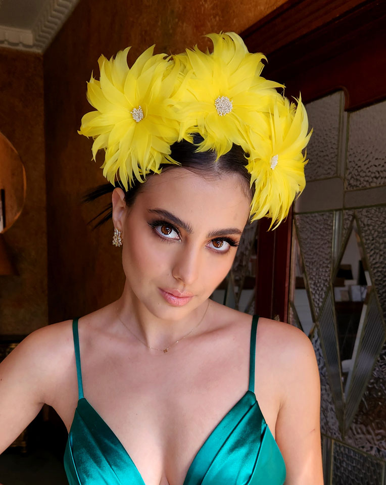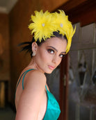 Race day crown and fascinators - Bold yellow feather flowers create this stunner piece. The Evelyn is fun and flirty and a bright statement. Contrast your headpiece to your race event or wedding outfit for something different.