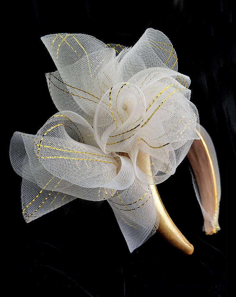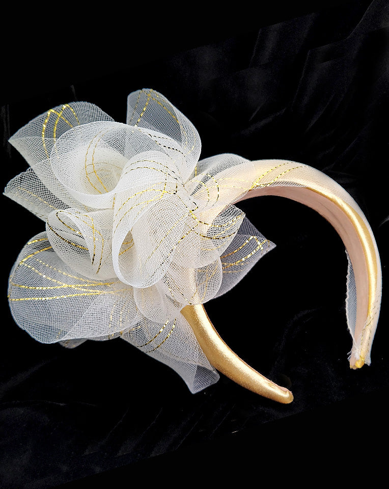 Race day crown and fascinators - metallic gold with crinoline twist high padded headband, Marlene. This a gorgeous piece that will complement many of your outfits. The Marlene is stylish and a comfortable piece to wear.