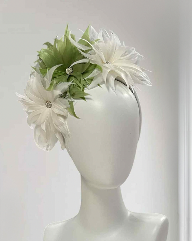Race day crown and fascinators - Sage and white triple feather flower headband, Olivia.