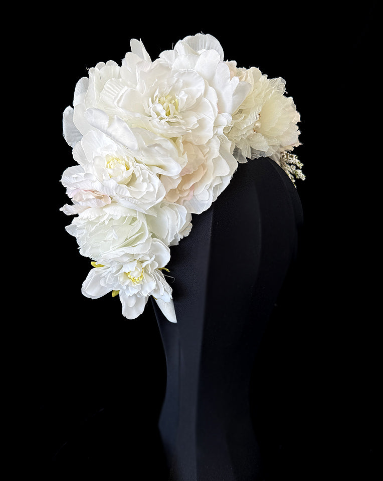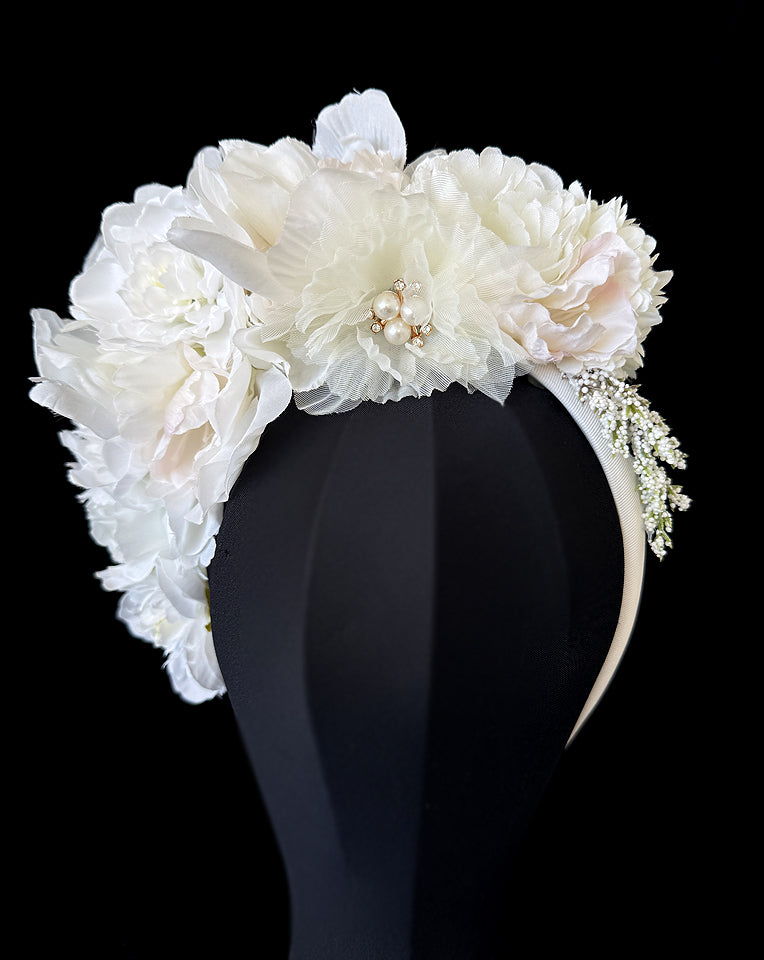 Race day crown and fascinators - A new white, ivory with a touch of blush version - inspired by our gorgeous floral headband, Pia. This is a beautiful mix of florals on a satin headband and comfortable piece to wear.