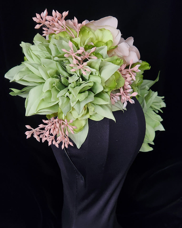 Race day fascinator - ONE ONLY IN THIS COLOUR. This gorgeous combination of apple green dahlias and delphiniums with blush rose. The bottom dahlia is detachable and can be placed on either side or added to the top!!