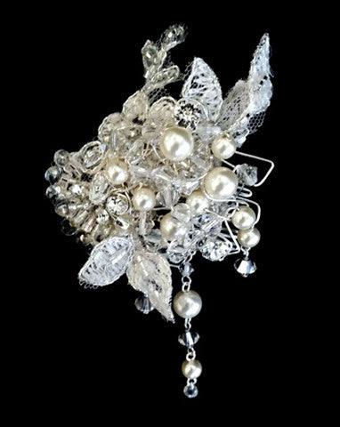 The Sachi was small clustered pearl and crystal. We have added a off white lace trim with touches of silver behind the original. The pearls are white. This piece will suit soft, feminine styles.