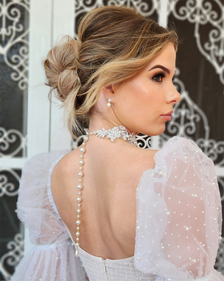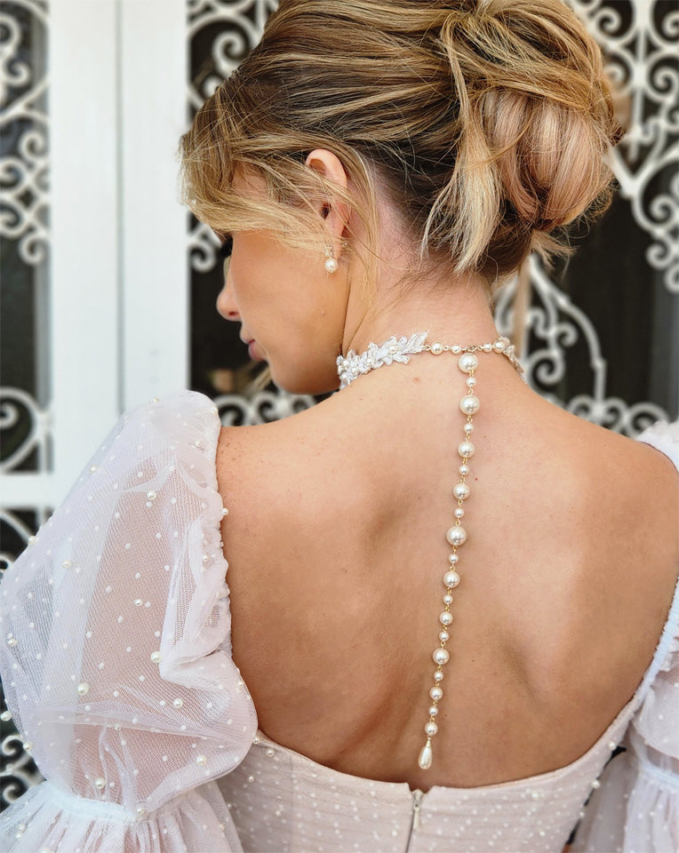 Wedding and bridal necklaces - lace and pearl choker with pearl drop back chain - Caylee by Kezani