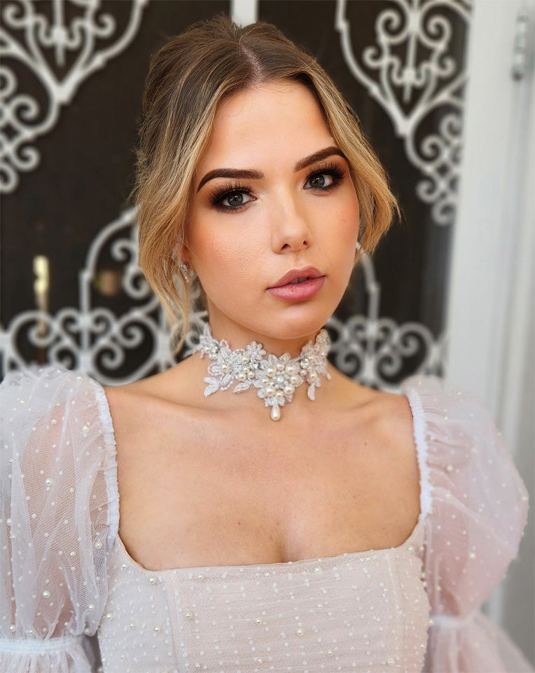 This is a special piece that can take your vibe many different ways. Enhance a gorgeous plain satin or mikado gown, with Caylee with a simple pearl earring and cathedral veil for pure elegance. For a fun and playful finish, add this lace choker to a bridal mini, perfect for an elopement, intimate micro wedding... and a wow finish to your second look. Time to party!!!